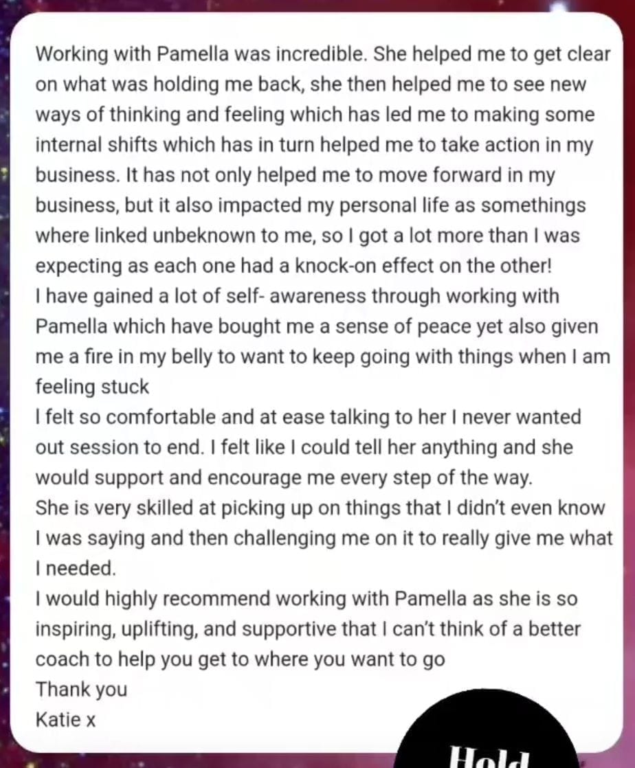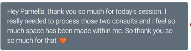 "When I had my consultation call with Pamella, I just knew right away I wanted to work with her. Pamella is someone who holds space for you, who you can laugh with and who will also give you a gentle yet needed reality check."
