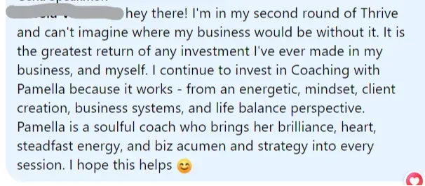 Pamella has been one of the best business investments I have made. I was in Thrive 1 and I've just renewed for a second round of Thrive because I think that is what my business needs. It is what I need.